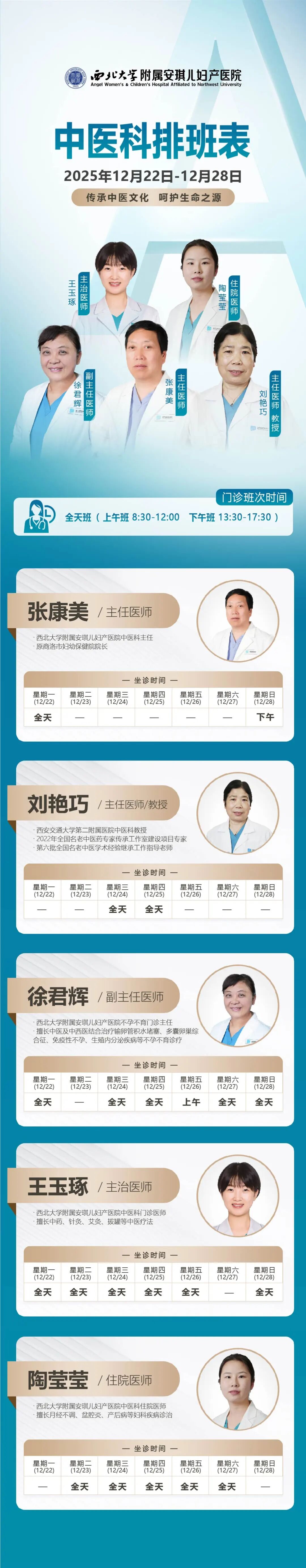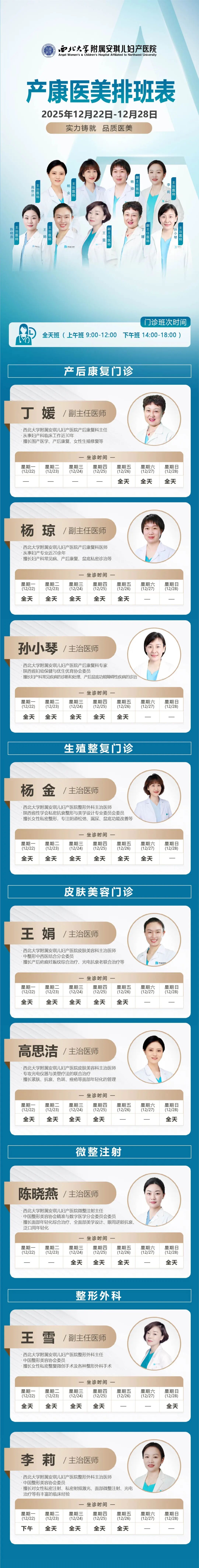 西安安琪儿妇产医院(12月22日至12月28日)专家坐诊时间表