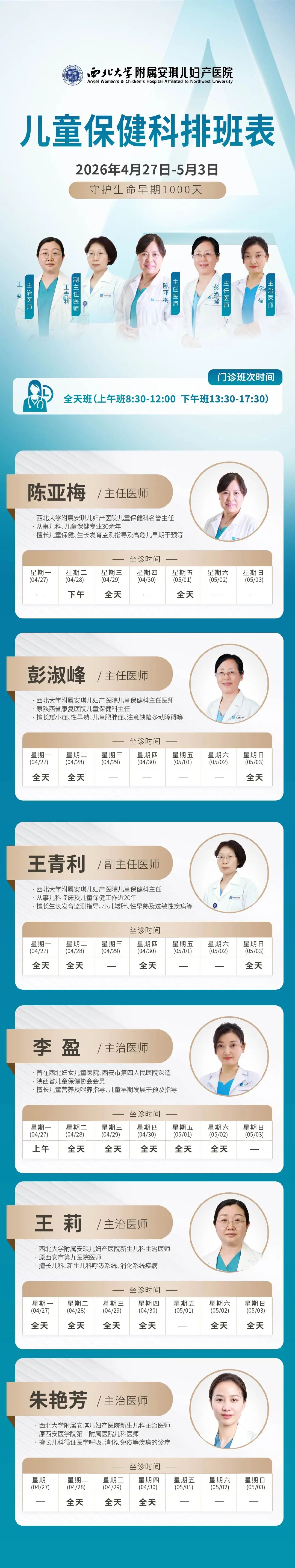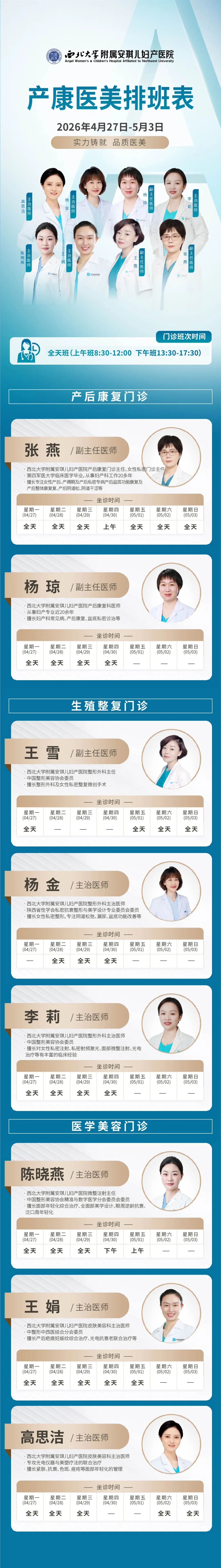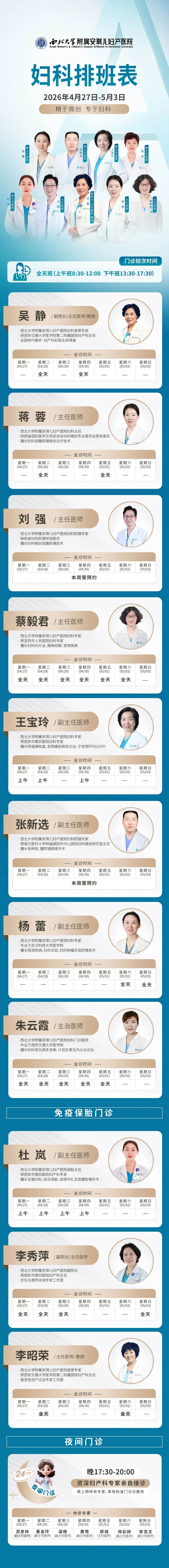 西安安琪儿妇产医院(4月27日至5月3日)专家坐诊时间表